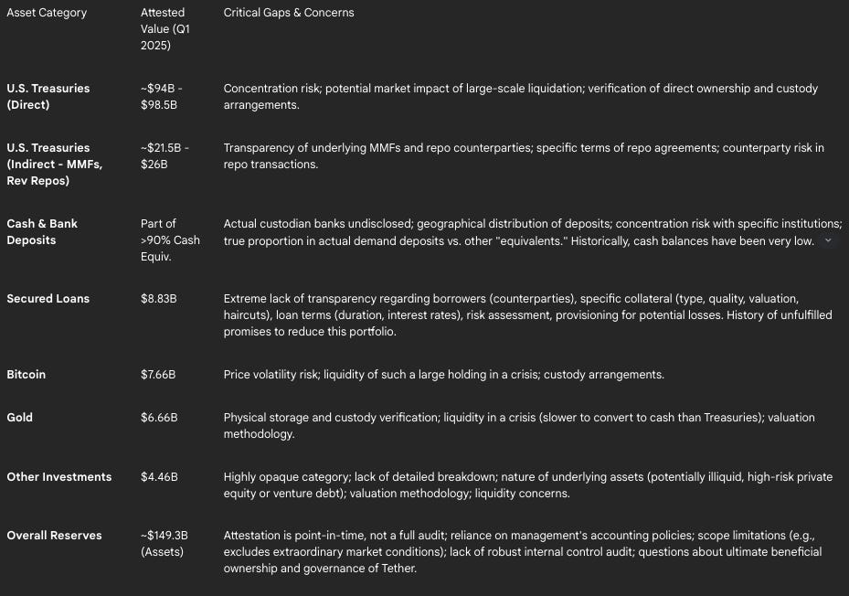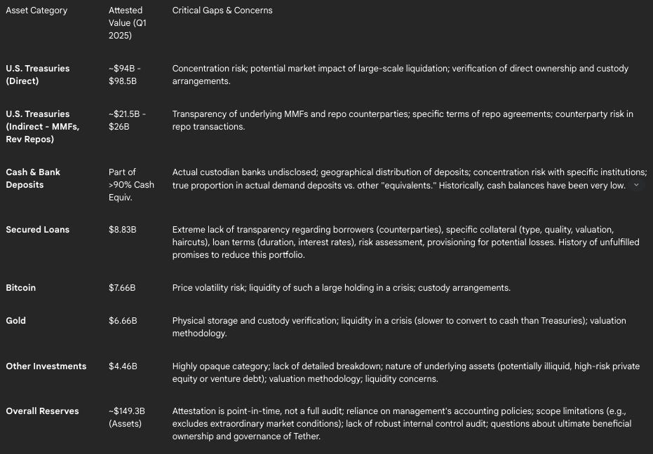 The following table summarizes the official claims regarding Tether's Q1 2025 reserve composition alongside the critical gaps and concerns that remain unaddressed by the current attestation regime: