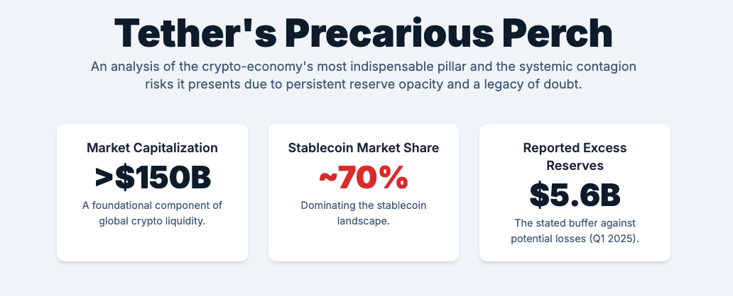 The fundamental tension lies in Tether's systemic importance juxtaposed with its inherent systemic risk. The crypto market's profound reliance on USDT has fostered a dangerous complacency regarding the underlying vulnerabilities of its issuer. This dependence on an entity with a checkered past and an ongoing reluctance to embrace comprehensive transparency creates a precarious situation where the stability of the many is tethered to the questionable practices of the few. The market needs Tether for its daily operations, yet Tether itself is a significant, poorly understood, and inadequately regulated source of risk. This "indispensable fragility" arises directly from the crypto ecosystem's dependency on an entity whose risk profile remains a subject of intense and valid concern. If this fragile pillar were to crumble, its indispensability would only amplify the destructive reach of its failure.