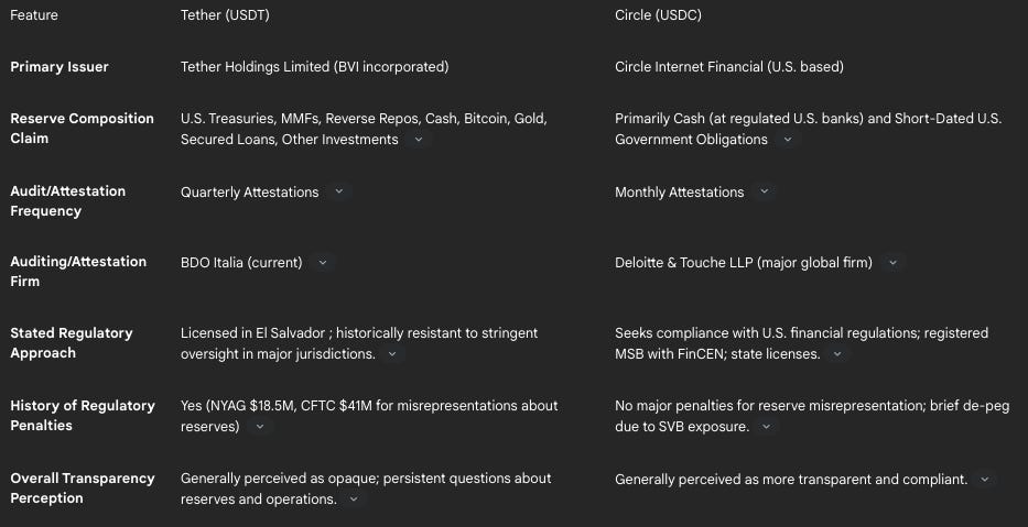 To provide further context on the differing approaches to transparency and regulatory adherence within the stablecoin market, the following table offers a comparative glance between Tether (USDT) and its main competitor, USD Coin (USDC):